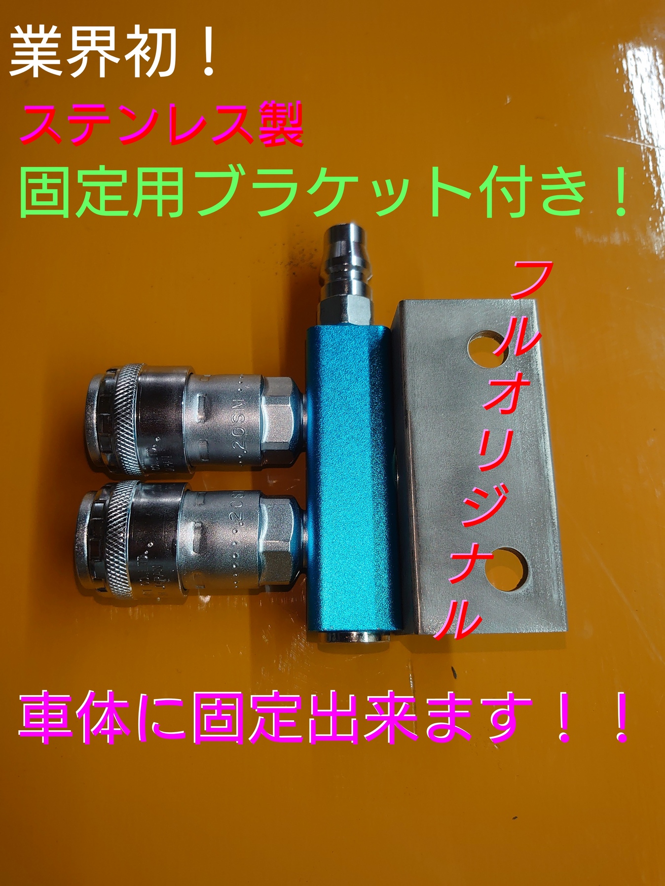ステンレス製固定ブラケット付のエアー分岐カプラー横差しタイプなります。/当店にてエアーパーツ取り付けの際に製作しておりましたが、この度製品化いたしました!/こちらの製品は車体の色々な場所に固定出来ますので、取り付け向き等お好みでご使用いただけます!!/横差しタイプですので従来取り付け出来なかった場所に小スペースで取り付け出来ます!!/固定用ブラケットはSUS304ですので錆びません!!/当店で1個ずつ製作しておりますのでエアー漏れ等もチェック済ですので安心してご使用頂けます!探していた方是非ご利用ください!